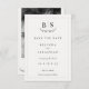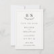 Simple and elegant black and antique white wedding save the date featuring some monographs, drawn foliage motif, fine line frame border and a black and white photo of the couple on the back.