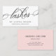 Minimalist and elegant business card for a lash artist with lashes written diagonally across the business card in a swirly script swooping above your name and service. Add your name, title, and contact info on the back in black letters against a blush pink background.