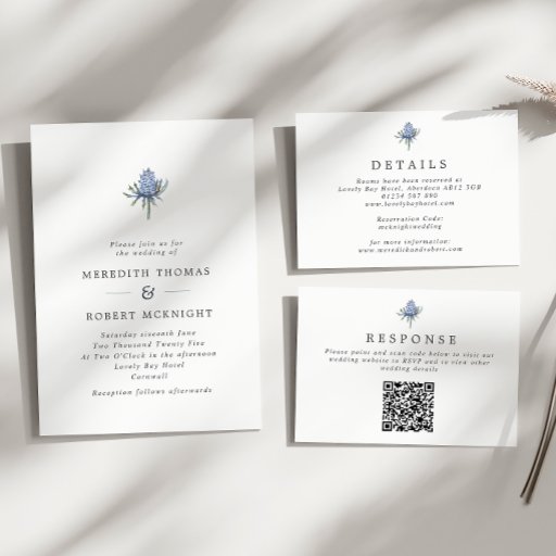 A simple wedding invitation featuring a single watercolor blue thistle flower, on a clean white background. Personalise with your details in dark grey.