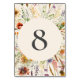 Wedding table number featuring minimalist typography design and boho wildflower floral illustration background.