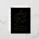 Announce your upcoming wedding in style with our Minimalist Calligraphy save the date postcards. The elegant save the date postcards feature the words "Save the Date" in a gold foil script with your names, wedding date, and wedding location shown below on a black background. The back of the foil save the date postcard features your return address and wedding details. Designed to coordinate with our Minimalist Calligraphy wedding collection.
