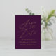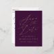 Announce your upcoming wedding in style with our Minimalist Calligraphy save the date postcards. The elegant save the date postcards feature the words "Save the Date" in a gold foil script with your names, wedding date, and wedding location shown below on a purple background. The back of the foil save the date postcard features your return address and wedding details. Designed to coordinate with our Minimalist Calligraphy wedding collection.