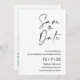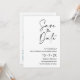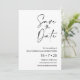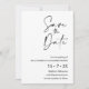 Minimalist calligraphy wedding save the date card featuring a modern calligraphy image and black text. This simple wedding save the date also features the couples photo within a white frame, on the back of the card.