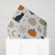 A calm, modern farmhouse–inspired Halloween pattern with a soft, neutral color palette. Stylized pumpkins in muted pumpkin orange, sage green, and warm ivory are scattered among simple black cat silhouettes, minimalist bats, crescent moons, delicate spiderwebs, tiny spiders, leafy sprigs, and subtle stars. Set against a light linen-textured background, the design feels understated, cozy, and elegant.