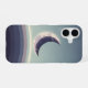 A stylized crescent moon resting above a planetary horizon, featuring a minimalist retro style.