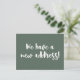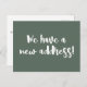 This modern minimalist we moved announcement postcard features fun brush lettering in dark sage green and white.