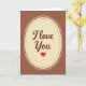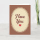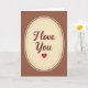 This card shows a tall cream-colored oval centered on a chocolate-brown background, giving it a cozy, classic look. Inside the oval, the words “I Love You” appear in smooth, flowing cursive lettering in a deep maroon color. A neat double border frames the oval, with a ring of tiny brown dots just inside a thin solid brown line. Beneath the words sits a single red heart, simple and bright, like a little reminder of what you’re trying to say ❤️. The warm browns and soft cream make the heart and message feel even more tender and focused. It’s the kind of design that feels steady and sincere, which can matter when you want your feelings to land without a lot of extra fuss. Giving this card says you care in a direct, comforting way, whether it’s for romance or a close friendship 🥰. Hope it helps you share your Valentine’s Day feelings in a way that’s easy and heartfelt.