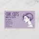 A simple and minimalist line drawing in dark purple of a chic hair style on a woman on a dusty purple background creates an elegant business card for a hair salon, hair stylist, or hair product sales.