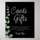This minimalist eucalyptus black cards and gifts sign is perfect for a rustic wedding or bridal shower. The design features a beautiful calligraphy font and a green watercolor eucalyptus in a dark background.