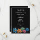 The wedding card features a minimalist yet elegant design with a black background that accentuates a vibrant bouquet of flowers at the bottom. The flowers are artistically illustrated in a variety of colours: blue, orange, green, pink, and blue, each with detailed petals and soft gradients that give them a lifelike appearance. This striking contrast between the dark backdrop and the vivid floral arrangement creates a sophisticated and modern aesthetic, perfect for a wedding invitation. The ample black space above the flowers provides a perfect canvas for personalised text, ensuring the focus remains on the joyous announcement. Personalise the card with your names and details of the wedding. You can download the card to your mobile device or computer. Card was created with help of ai.