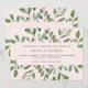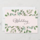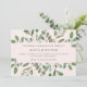 This trendy wedding invitation features a frame of abundant watercolor green leaves and a few tiny berries on a soft, blush pink background. The back of the invitation also says "Wedding" in elegant calligraphy.