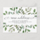 This trendy botanical change of address postcard features a frame of abundant watercolor green leaves and a few tiny berries on a clean white background. The words "new address" appear in elegant, swirly calligraphy. A simple yet stylish moving announcement that you'll be proud to send to friends and family.