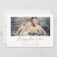 This minimalist gold Happy New Year landscape photo holiday card is the perfect simple holiday greeting. The design features classic gold and white typography paired with a rustic yet elegant script font with hand lettered style. Personalize the card with a family photo, your family name, first names, and year.