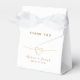 Simple, elegant, minimalist, modern white wedding favour box with bride and groom names, date and gold rope heart.