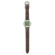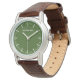 Minimalist green face custom women's watch. Create your own custom brand name luxury dress watch. Classy timeless watch dial design with fine indices including minutes and hours but without the numbers. Add your own custom monogram, personalised name, designer name, initials, birth year, logo, icon, photo image etc. Sophisticated modern style watch face with elegant script typography template. Luxurious timepiece for her. Make it a cool new present for bride to be, bridesmaids, mum, mother, wife, sister, daughter, grandmother, grandma, stepmom, aunt, flower girl, co worker, employee, company boss, business partner, colleague, best friend, teacher, coach or retired person. Unique monogrammed gift ideas for women's Birthday, graduation, anniversary, retirement, Holidays, wedding party, dinner, appreciation, employment, duty, service etc. Small diameter around 23 mm. Classic vintage look with chic 14 mm black leather wrist band strap. Olive green or custom background colour. Perfect for 20th 30th 40th 50th 60th 70th 80th 90th age year celebrations. Affordable ladies' quartz watches under $100. Nice for casual everyday use and special occasions. Also available for other models with black leather or steel bracelet.