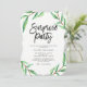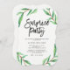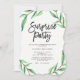 These modern, minimalist style surprise party invitations feature a clean white background with green watercolor leaves and black typography.
