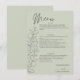 A timeless wedding menu card featuring hand-drawn eucalyptus sprigs on a light sage green background. Elegant script and classic serif fonts combine to highlight the menu details and couple’s names. Perfect for nature-inspired or minimalist weddings with a romantic touch.