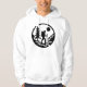 This minimalist black-and-white hoodie design features a silhouette of a hiker exploring a scenic natural landscape. The hiker is equipped with a backpack and trekking poles, surrounded by a tall pine tree, stylised hills, and the sun in the background. Encased in a circular frame, the clean lines and sharp contrast emphasise a connection with nature and the spirit of adventure. This modern, outdoor-themed design is perfect for hiking enthusiasts and nature lovers who appreciate simplicity and bold imagery.