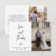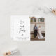 Modern, minimalist wedding thank you card featuring a modern calligraphy heading image, the couples photo and small hearts image. The back of the card also features a photo of the couple and a message to friends and family.