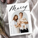 Modern Christmas photo card featuring "Merry" displayed in a bold black script at the top of the design with a white background. Your vertical photo is displayed inside an arch frame. Personalise the front of the photo Christmas card with your family name and year. The back of the simple holiday card displays your personal message.