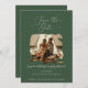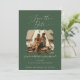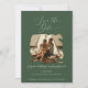 Simple, minimalist design in forest green and soft taupe. Featuring a watercolor brush stroke shaped framed opening to customise your engagement photo. A calligraphy handwriting script font with flourishes is used for the "Save the Date," title. Art graphically designed by internationally licensed artist and designer, Audrey Jeanne Roberts, copyright.