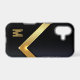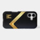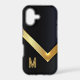 This dramatic, but simple phone case works equally well for a man or woman. A shiny gold bar in a V shape runs across the case, with your monogram in a distressed gold and black font at the bottom. Everything is placed on a black background.