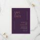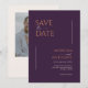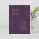 These 5" x 7" save the date cards feature a minimalist design in melon orange and cream letters on an eggplant purple background with placeholders for the engaged couple names, wedding date, and venue information. The back has a spot to insert your favourite photo with the couple names and wedding date.