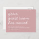 A moving announcement postcard in pastel pink background featuring a simple and casual hand lettering saying "your guest room has moved". Personalise the details to your own liking.