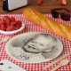 Vintage photo 80th birthday plates featuring personalized childhood picture, custom party table decor for nostalgic celebrations.