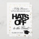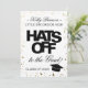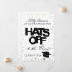 This black and white photo graduation announcement with a gold confetti border reads "Hats Off to the Grad" with a simple black graduation cap illustration on the front and space for a photo of your student on the back. Personalise the front with the graduate's name, school name, graduation year and personalise the back with your student name, school name, future goals and party or ceremony details.