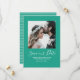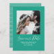 Minimalist Photo Save the Date Announcement with a fresh and simple square photo cutout design in green. Add a photo and your wedding details to customise. Thin white stripes adorn the back of the invite. Background colour on back side of invite may be changed to complement the photo or to add your wedding colour.