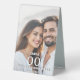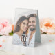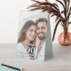 Add a personalized, elegant touch to your reception décor with this portrait-style photo table number stand template. Designed for weddings, engagements, couples showers, and anniversaries, this stylish display features a fully editable photo of the couple beneath a layer of soft, translucent overlay. The overlay ensures the white text with black drop shadow appears crisp, readable, and beautifully balanced against any photograph.