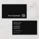 Photographer business cards in a classy minimalist design featuring your profession and camera icon on the front and your contact details on the back all in classic black and white.