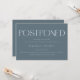 Postponing a big event like your wedding can be stressful, but you can still look stylish with this modern and minimalistic change of plans template card. It says "postponed" in stylish and noticeable font at the top followed by your event information and regrets. The background is slate blue.