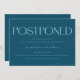 Postponing a big event like your wedding can be stressful, but you can still look stylish with this modern and minimalistic change of plans template card. It says "postponed" in stylish and noticeable font at the top followed by your event information and regrets. The background is teal.