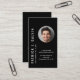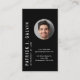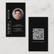 Minimalist professional black business card featuring your photo in a circle frame, your name and title in modern white typography on the side, and your contact information (such as email, telephone numbers, firm name and mailing address) in clean, simple white typography. On the back, input a URL address to create a scannable QR code linked to your website, social media profiles, or any other platform that showcases your work, and customise additional text or leave blank.
