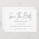 Minimalist Script Any Colour Save The Date. Simple elegance with Save The Date in a modern set script.The rest of the text you can easily personalise. Shown here in black on white however the text and background colours can be changed if you wish via the customise further option.
