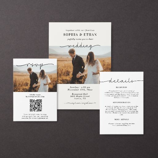 This modern and elegant wedding invitation beautifully blends classic sophistication with a fresh contemporary touch. The front features a full, warm-toned photograph of the couple, creating an intimate and personal centerpiece. Elegant calligraphy highlights the couple’s names and key wedding details, while a clean sans-serif font balances the layout for a minimalist, refined look. The beige-and- black colour palette enhances the timeless appeal, letting the photo and typography shine. The back design includes two photos at the top and bottom with a monogram or initials showcased in the centre, creating a cohesive, stylish, and meaningful design that couples will cherish. Perfect for formal, chic, and modern weddings.