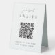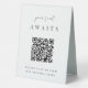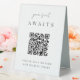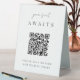 Make it easy for your wedding or event guests to find their seat with this QR code table tent sign. "Your seat awaits" appears at the top, with brief instructions beneath. Enter the url for your seating assignments, and the QR code will update. Guests can scan the code to easily find their spot.