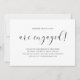 A typography engagement party invitation featuring the words, "are engaged!" in black calligraphy over a white background. The backside is black and may be changed to any colour you wish. The simple minimal layout and lots of open space give this design a modern feel and the calligraphy lettering and heart on the exclamation point give it a romantic twist.