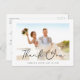 This is a minimalist and modern photo wedding thank you card using an elegant handwritten script font, printed on a convenient postcard.