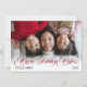 Simple, minimalist one large 5" x 7" family photo featuring script text calligraphy "Warm Holiday Wishes" in red with a semi-opaque white fade on bottom into your photo beneath. Simply add your family name and the year. The back features a grey and white snow pattern. Composite design by Holiday Hearts Designs. Template placeholder photo via Pexels.