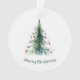 A minimalist style watercolor Christmas tree decorated with colourful lights.