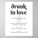 Add personality to your reception with this minimalist wedding bar sign featuring the playful headline “drunk in love.” The clean white background and bold black typography keep the design modern and timeless, while the layout clearly lists your beer, wine, spirits, and other drink options. A perfect mix of style and fun, this drink menu doubles as practical decor for your bar area. Available as a printed sign or digital download for easy printing at home or at your venue.