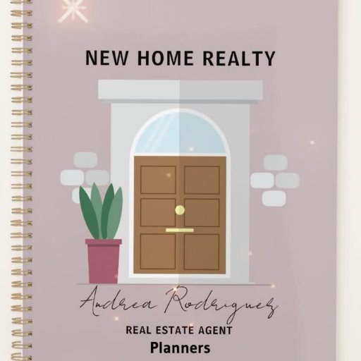 This elegant and modern notebook design is perfect for real estate professionals. The minimalist graphic style features a stylised front door with an arched window, flanked by wall sconces and a potted plant. The bold text above the door adds a professional touch, while the customisable area below allows you to personalise it with your name and title. The soft pastel pink background exudes warmth and welcome, making it an ideal companion for note-taking on-the-go.