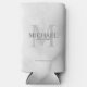 This can cooler features personalised groomsman's name with title and wedding date in grey and monogram in light Nureyev as background, in classic serif font style, on white marble background.