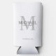 This can cooler features personalised groomsman's name with title and wedding date in grey and monogram in light grey as background, in classic serif font style, on white background.