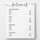 Customise this modern minimalist white salon service menu sign plaque with black script typography to easily create a price list for your services. Perfect for hair salons, nail salons, lash extension and makeup artist services, beauty bars, spas, aesthetician services and more etc. Use the customise tool to change font and background colours. Contact us if you need help: yourstyle@pgco-designs.com.