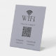 Make Wifi access easy and stylish with this Black Wifi Password Sign with QR Code Pedestal Sign on muted blue background. Perfect for Airbnb, VRBO, homeaway hosts, vacation rentals, short-term rental house, guest rooms, cafés, salon, studio and offices, this minimalist Wi-Fi desk sign helps guests connect quickly.