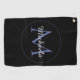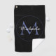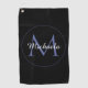 Minimalistic blue circle modern monogram with blue initial and white name on black. Personalizable custom name with a serif initial behind on a black colour.